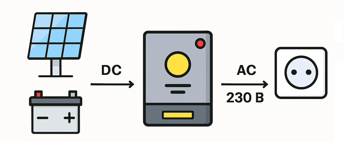 Інвертор — це пристрій, який перетворює постійний струм (DC) від акумулятора чи сонячних панелей у змінний струм (AC 230 В), придатний для живлення побутової та професійної техніки.