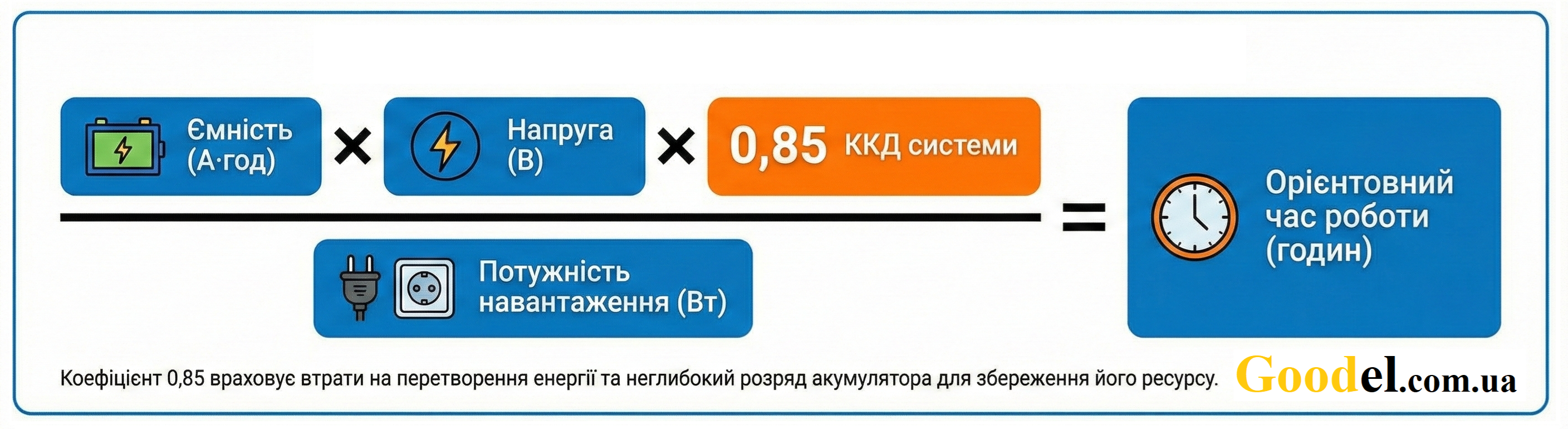 [ Час роботи = Ємність (Ah) × Напруга (V) × 0,85 / Потужність навантаження (Вт) ]