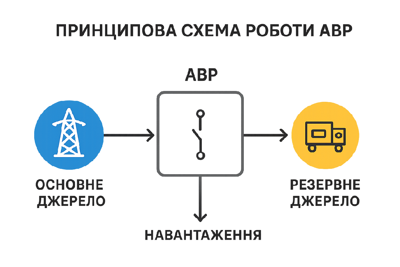 АВР — це система, яка автоматично перемикає навантаження із основного джерела живлення (мережа) на резервне (наприклад, генератор, інвертор, батареї) у випадку відключення або нестабільності основної електромережі.