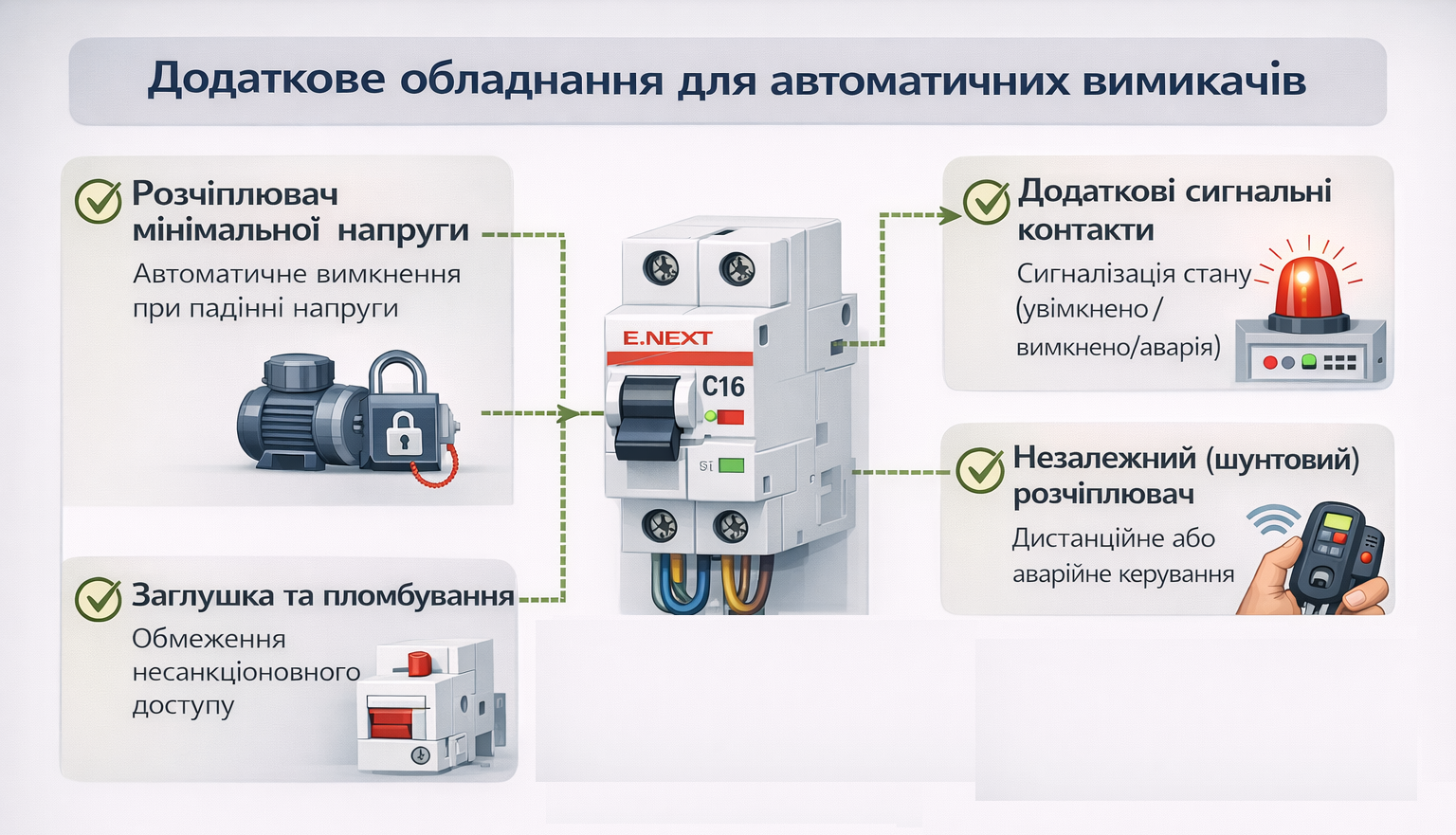 Саме для цього використовується додаткове (допоміжне) обладнання до автоматичних вимикачів, яке розширює їх функціональні можливості та дозволяє адаптувати електрощит під конкретні задачі об’єкта.